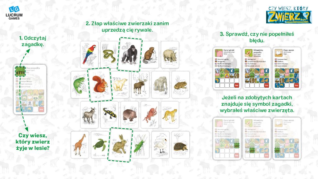 Odsłoń kartę, przeczytaj zagadkę i znajdź właściwe zwierzaki zanim uczynią to Twoi rywale. Jeżeli zbierzesz ich najwięcej, wygrywasz rundę. Podczas rozgrywki poznasz też nazwy zwierząt w innych językach: po angielsku, niemiecku, francusku, włosku oraz po łacinie! CZY WIESZ, KTÓRY ZWIERZ… to seria aż czterech gier. Wszystkie można traktować jako samodzielne tytuły; dodatkowo części Świat, Europa oraz Afryka i Azja można także łączyć ze sobą.