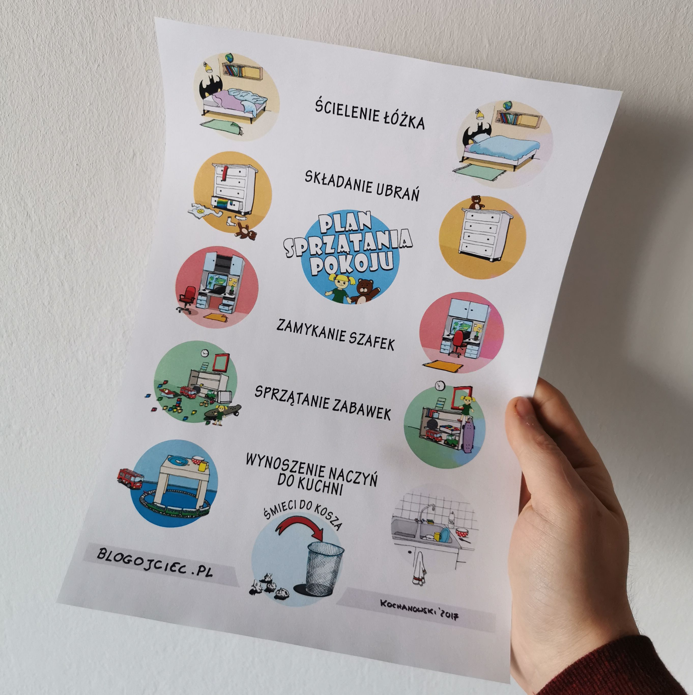 Plakat pomagający dzieciom utrzymać porządek w pokojach.