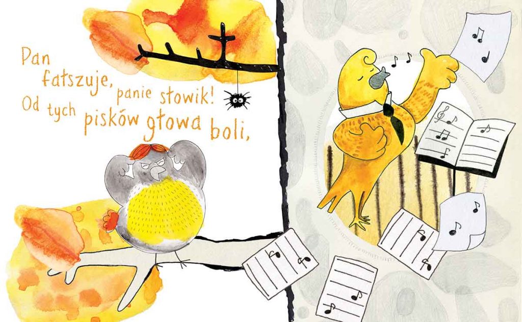 Na każdej z barwnych ilustracji Wróbel-egoista ucisza inne ptaki, częstując je niesmacznymi komplementami. Najpierw słowika (co widzisz na poniższej ilustracji), a następnie kruka, mówiąc, że kracze z rana niczym jakaś kra łamana. Choć samo stwierdzenie nie jest miłe, to niektórzy (pewnie głównie autor) doceniają dźwiękonaśladowczą trafność porównania.